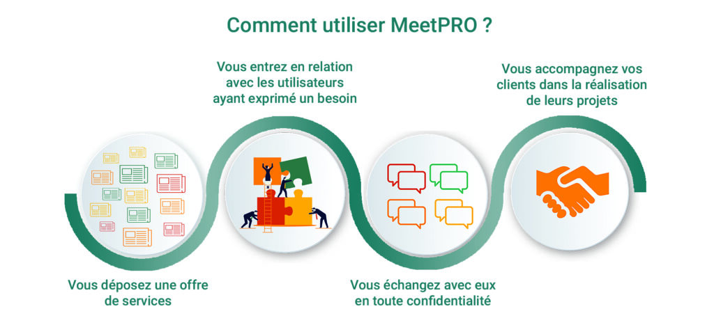 MeetPRO propose des outils pour faciliter la mise en relation tel qu’un algorithme de matching automatique permettant de faire correspondre les besoins d’accompagnement avec les compétences des experts. Un t’chat confidentiel est également mis à la disposition des utilisateurs afin d’échanger en toute discrétion.